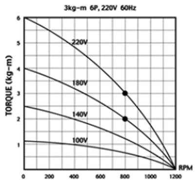 입력을 변화시키는 경우 Torque는 전압의 약 2승에 비례하여 변화한다. 예를 들면 정격 3kg-m, 6P, 220V, 60Hz의 경우 220V, 800rpm에서 Torque는 3Kg-m이나 입력전압을 180V로 변화시키면 Torque는 T = (180/220)2X3 = 2(kg-m)로 변한다.